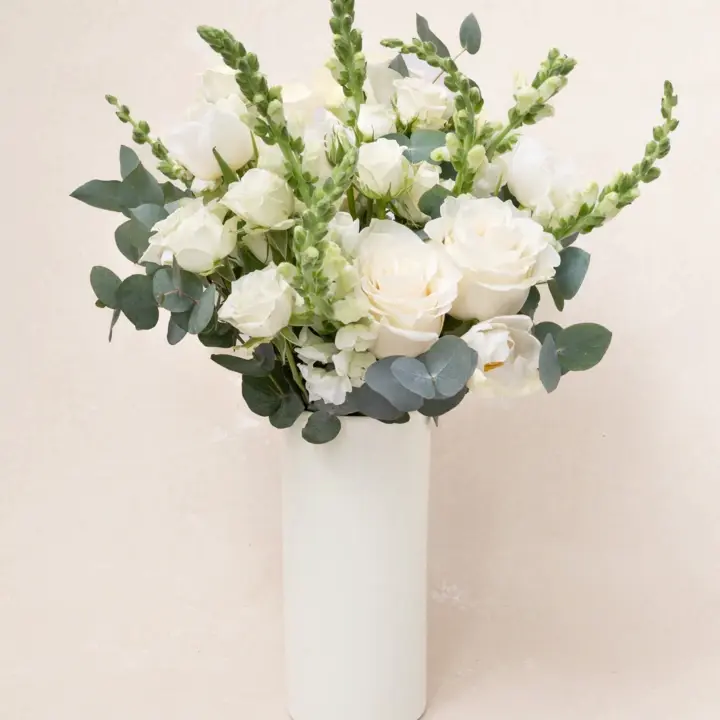 Gėlių puokštė „Baltoji elegancija“ – rafinuotas baltų žiedų ir eukalipto žalumos derinys, skleidžiantis ramybę, tyrumą ir gaivą. Ši puokštė įkūnija natūralaus grožio paprastumą ir išlaikytą prabangą. Ji puikiai tinka vestuvėms, krikštynoms ar dovanai, kai norisi perteikti šviesą, švelnumą ir subtilų išskirtinumą.